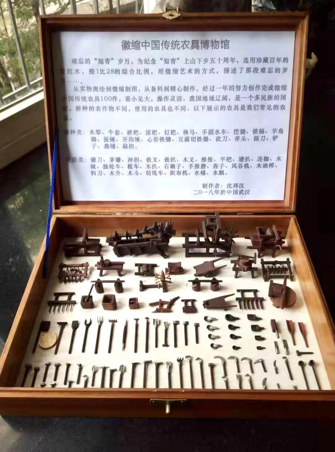 微缩中国传统农具系列100件,被扛旗世界纪录评为世界上数量最多的“中国传统农具系列”微缩作品。