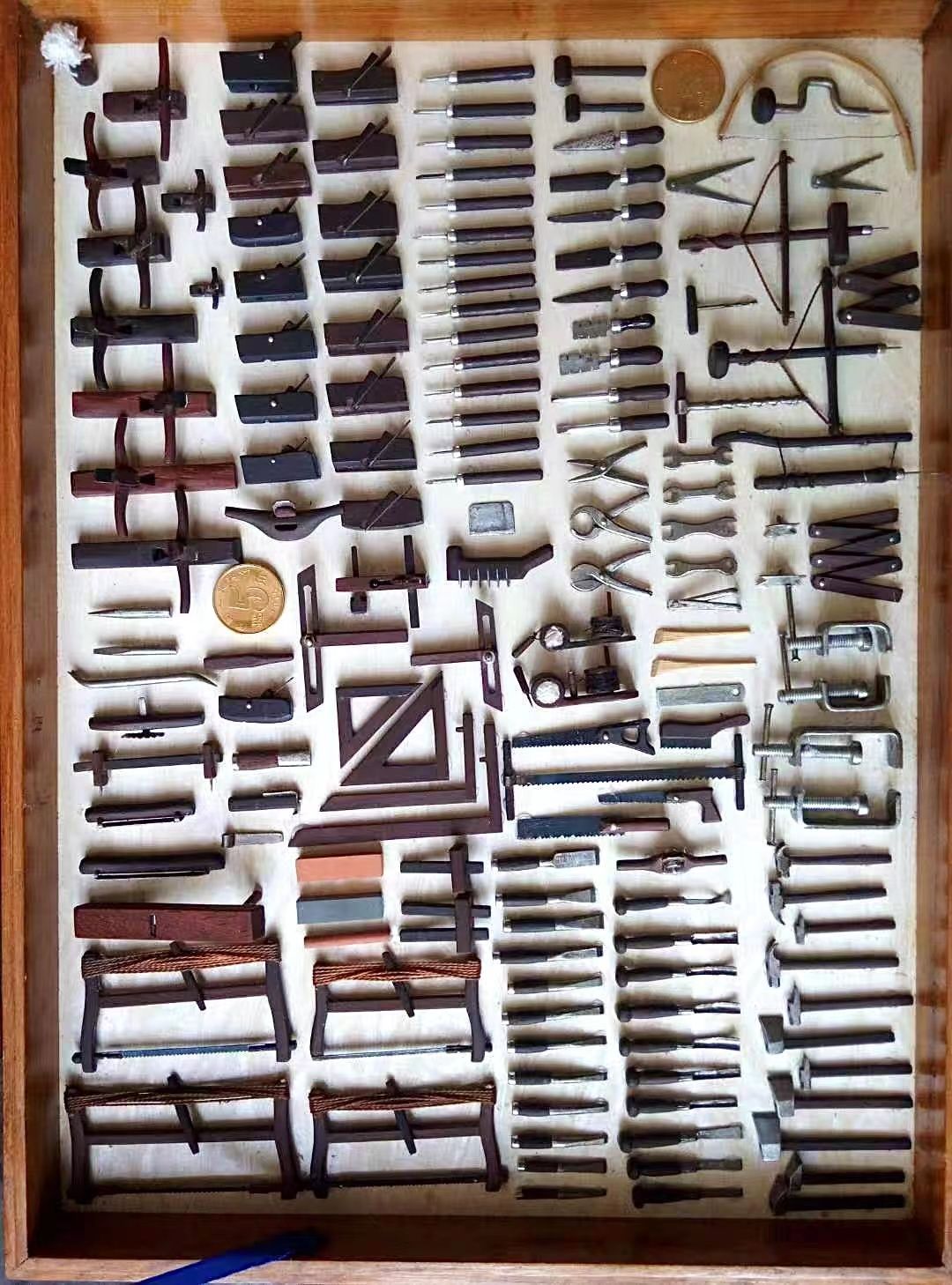 按照16:1的综合比例,沈邦汉历时一年精心制作微缩中国传统木工工具系列160件。