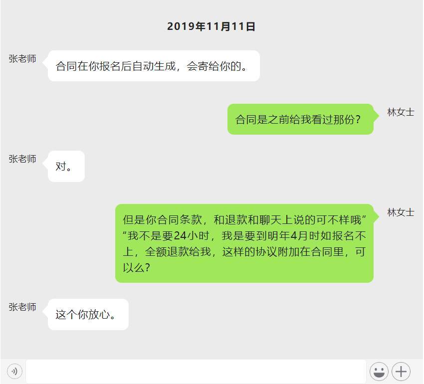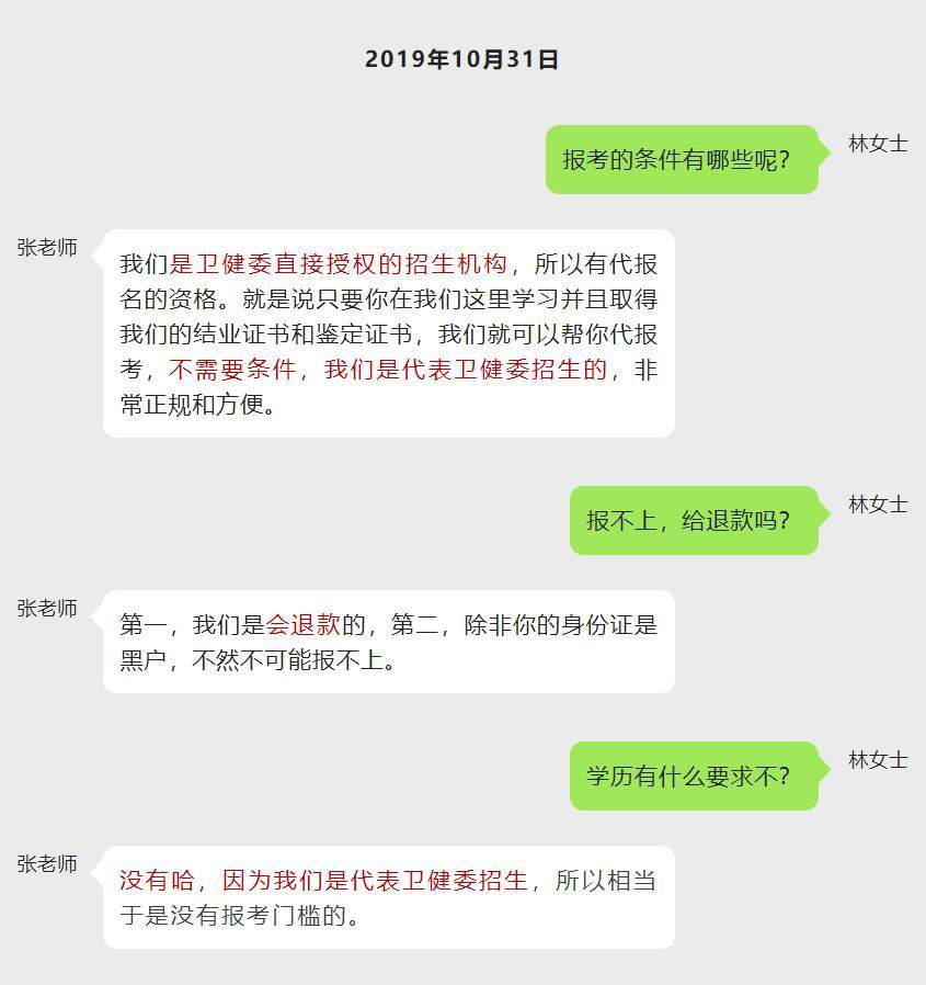 此后,林女士咨询报考事宜,对方多次宣传其是卫健委的直接授权机构,有代报名资格,学员不限学历不需要任何条件保证能报上名和通过考试,并承诺报不上全额退款等。
