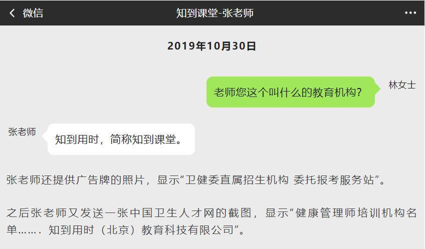 2019年10月,广州消费者林女士接到了知到用时(北京)教育科技有限公司(以下简称知到用时公司)销售人员的电话,对方劝导林女士参加2020年4月考试的健康管理师培训考试取证。
