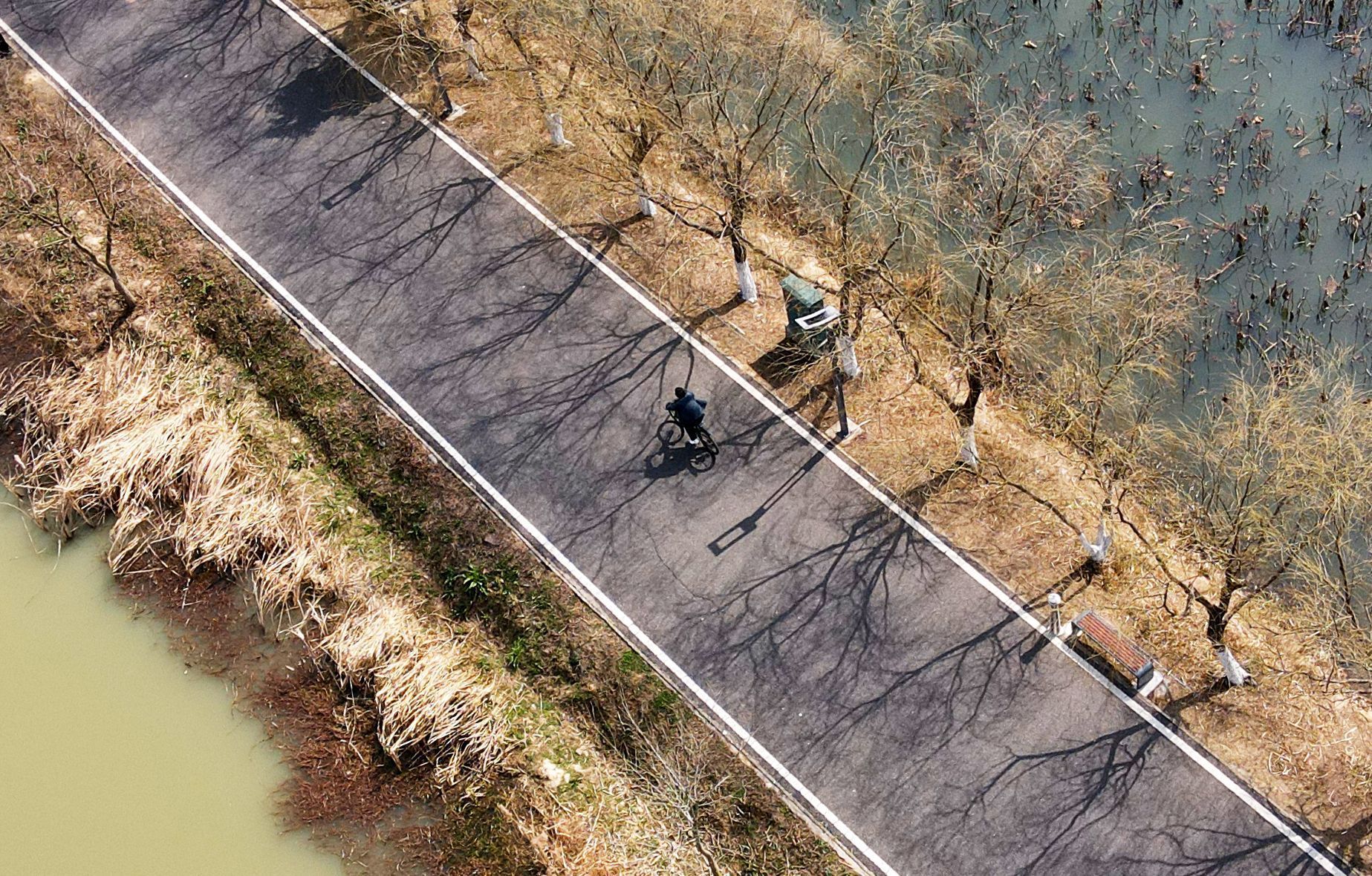 在后官湖湿地公园,不少市民来到户外骑行 记者李子云 摄