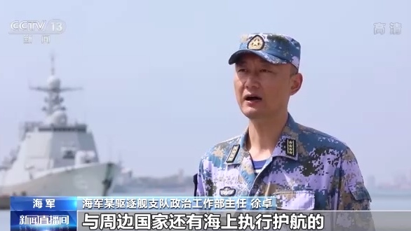 海军某驱逐舰支队政治工作部主任 徐卓:海军以护航任务为依托,与周边国家还有海上执行护航的其他国家加强了交流和沟通,相互之间也取得了默契和信任,同时也展示了人民海军新时代良好形象。