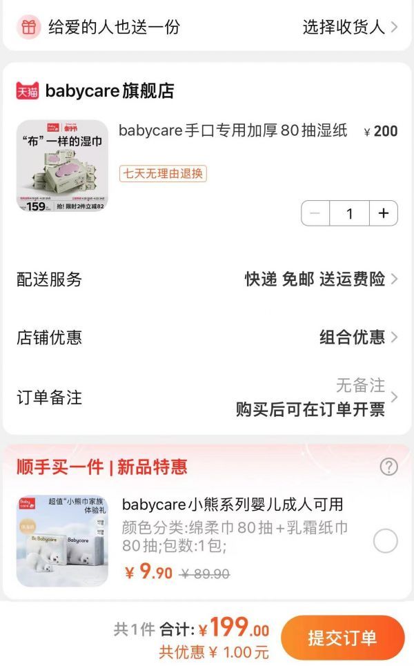 截止到今年2月,babycare通过“顺手买”的下单数达到35.8万件;以三巾系列为例,“顺手买”为三巾品类带来新客19.9万,品类新客率达到81%。