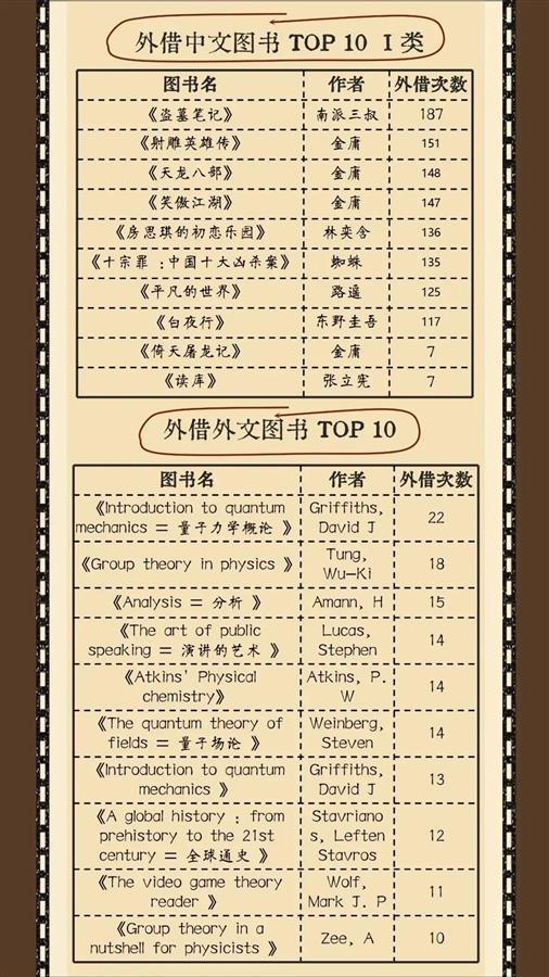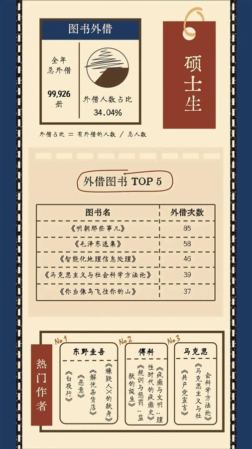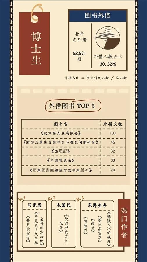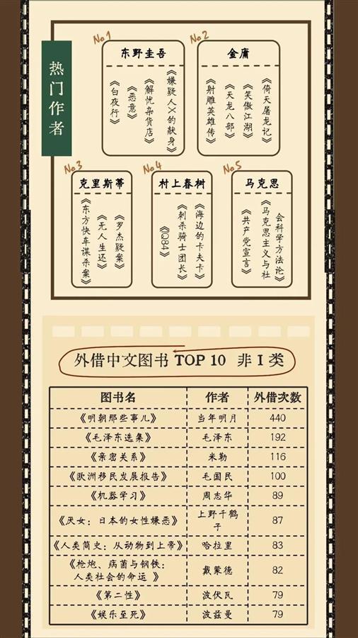 整体而言,最受武大师生欢迎的热门作者分别是东野圭武、金庸、克里斯蒂、村上春树和马克思。在外借中文图书中,《盗墓笔记》《射雕英雄传》《天龙八部》,以及《明朝那些事儿》《毛泽东选集》和《亲密关系》外借次数最多。《明朝那些事儿》《盗墓笔记》是最受本科生和硕士生欢迎的书籍,硕士生偏爱《明朝那些事儿》和《毛泽东选集》,而博士生中,《欧洲移民发展报告》《欧盟及其成员国移民与难民问题研究》两本外借次数最多。
