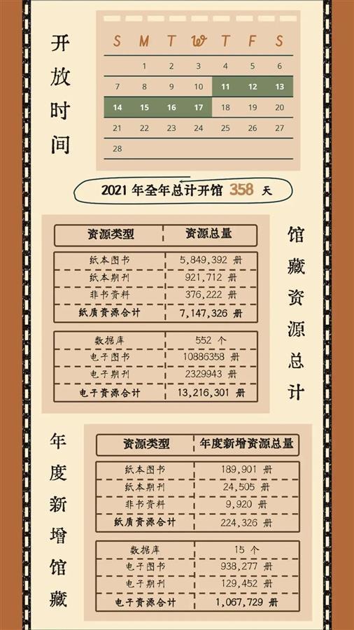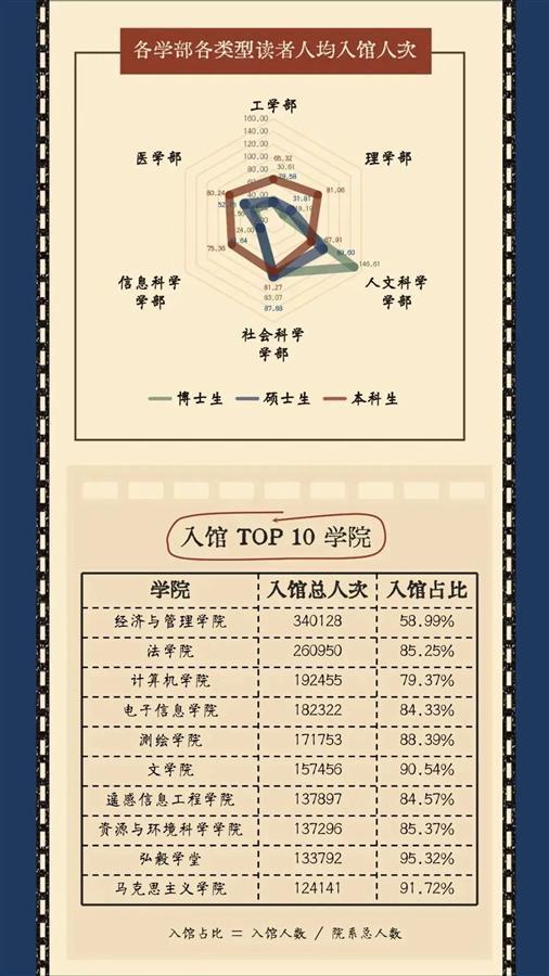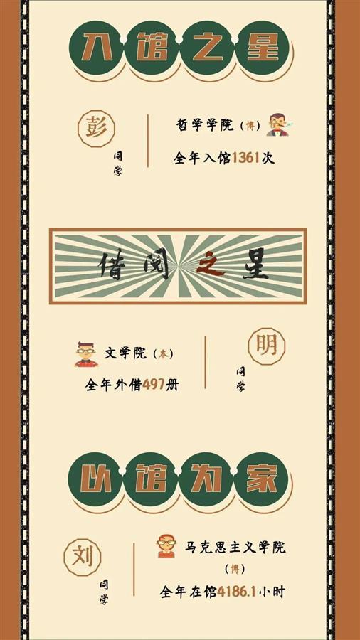 《阅读报告》显示,2021年入馆次数最多的学生是一位哲学学院的博士生,全年入馆1360次,平均每天到馆4次;在馆时长最长的学生是一位马克思主义学院的博士生,在馆近4200小时,平均每天在馆超过11小时;外借次数最多的是一位文学院本科生同学,年借阅497册;师生人均下载电子文献650篇、检索电子文献1.5万次;疫情期间,武大图书馆数据库使用量大幅提升,外文数据库的下载量翻了一番。