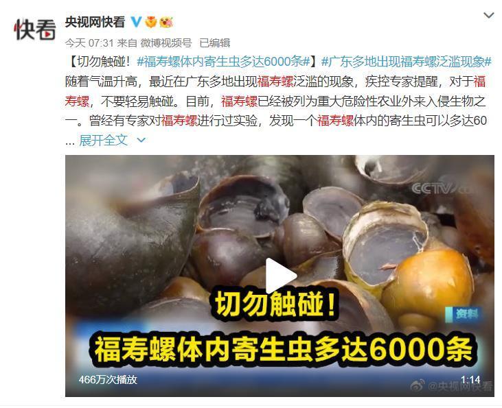 随着气温升高,最近在广东多地出现福寿螺泛滥的现象,疾控专家提醒,对于福寿螺,不要轻易触碰。目前,福寿螺已经被列为重大危险性农业外来入侵生物之一。曾经有专家对福寿螺进行过实验,发现一个福寿螺体内的寄生虫可以多达6000条,未煮熟食用后,轻则发烧拉肚子,重则危及生命。