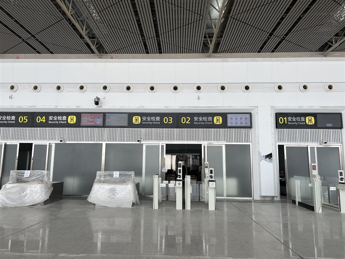 在航站楼一楼,通过全新的自助防爆闸机进入内部,6300平方米的玻璃幕墙规模宏大,阳光透过1348块超白双银中空玻璃照射进来,大厅内明亮又宽敞。位于大厅前方不远处的自助行李托运点功能齐全完善,扫描身份证、人脸识别、自助称重,还可以打印登机牌,为乘客提供了便利。