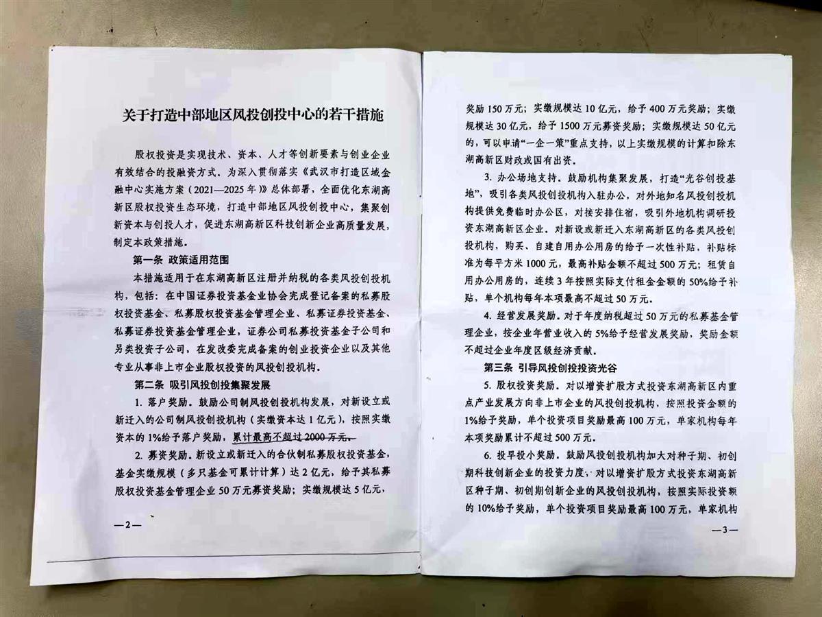 4月24日,武汉东湖高新区出台《关于打造中部地区风投创投中心的若干措施》(简称“创投十条”),在风投创投资本与人才、优化风投创投行业管理、营造一流风投创投生态等方面提出系列激励措施,其中部分政策为全国或中部首创。