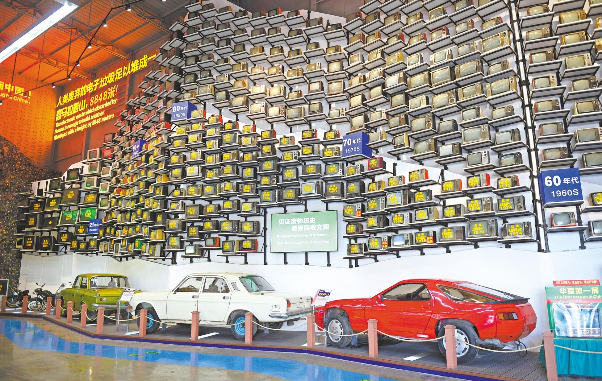 格林美武汉园区展厅陈列了百余台跨越半个世纪的旧电视机和旧汽车,寓意见证废物历史,感受回收文明。