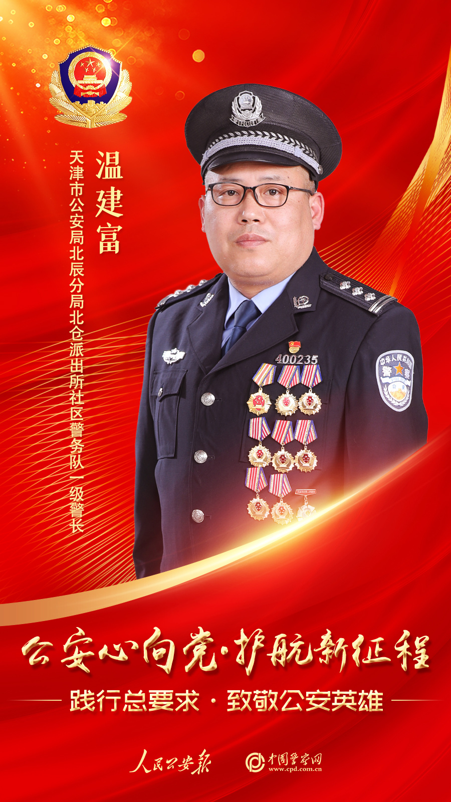 从警27年,温建富先后荣立个人一等功1次、个人三等功7次,多次获得天津市优秀人民警察称号。