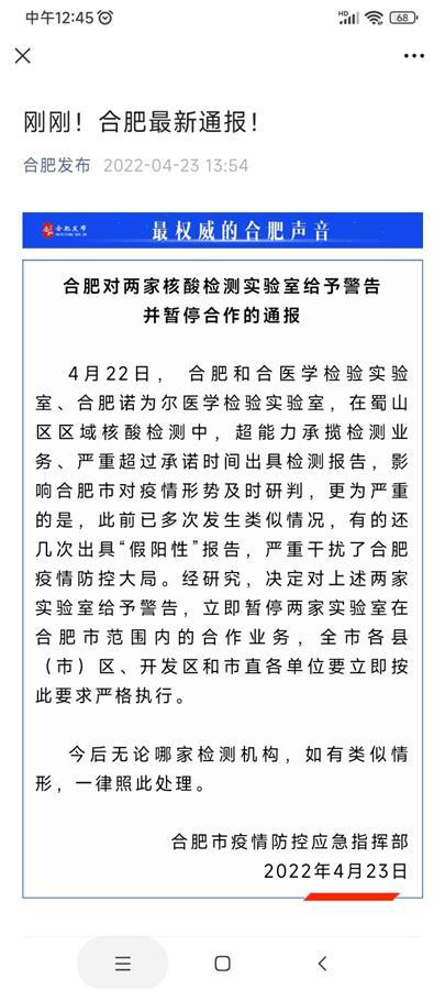 4月23日,合肥市人民政府新闻办公室官微“合肥发布”发布通报称,4月22日,合肥和合医学检验实验室、合肥诺为尔医学检验实验室在蜀山区区域核酸检测中,超能力承揽检测业务、严重超过承诺时间出具检测报告,影响合肥市对疫情形势及时研判,更为严重的是,此前已多次发生类似情况,有的还几次出具“假阳性”报告,严重干扰了合肥疫情防控大局。经研究,决定对上述两家实验室给予警告,立即暂停两家实验室在合肥市范围内的合作业务。