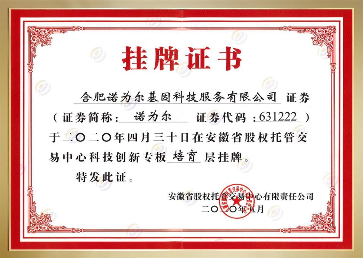 2020年4月30日,合肥诺为尔基因科技服务有限公司在安徽省股权托管交易中心科技创新专板培育层挂牌。