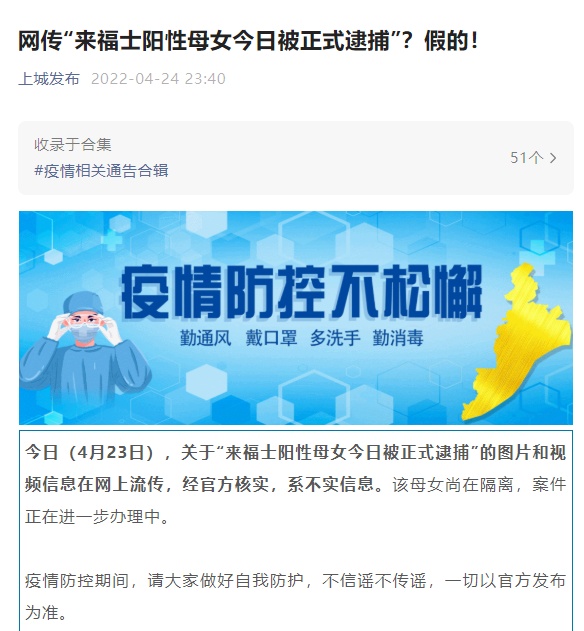 4月23日,关于“来福士阳性母女今日被正式逮捕”的图片和视频信息在网上流传,经官方核实,系不实信息。该母女尚在隔离,案件正在进一步办理中。