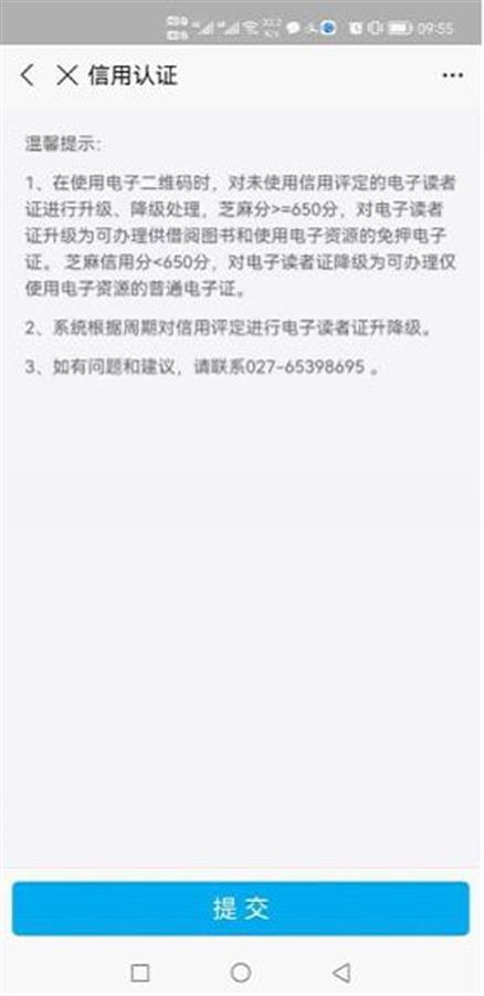 据了解,读者只需要在支付宝首页搜索“湖北省图书馆”,进入后绑定已有的电子证,点击“二维码”。认真阅读“信用认证”须知后,点击“提交”按钮。阅读《服务协议》,点击“同意协议并使用”按钮。芝麻分≥650分,同意协议并使用。 进入电子证升降级,填写并提交,按照指引,便可借阅实体书啦!