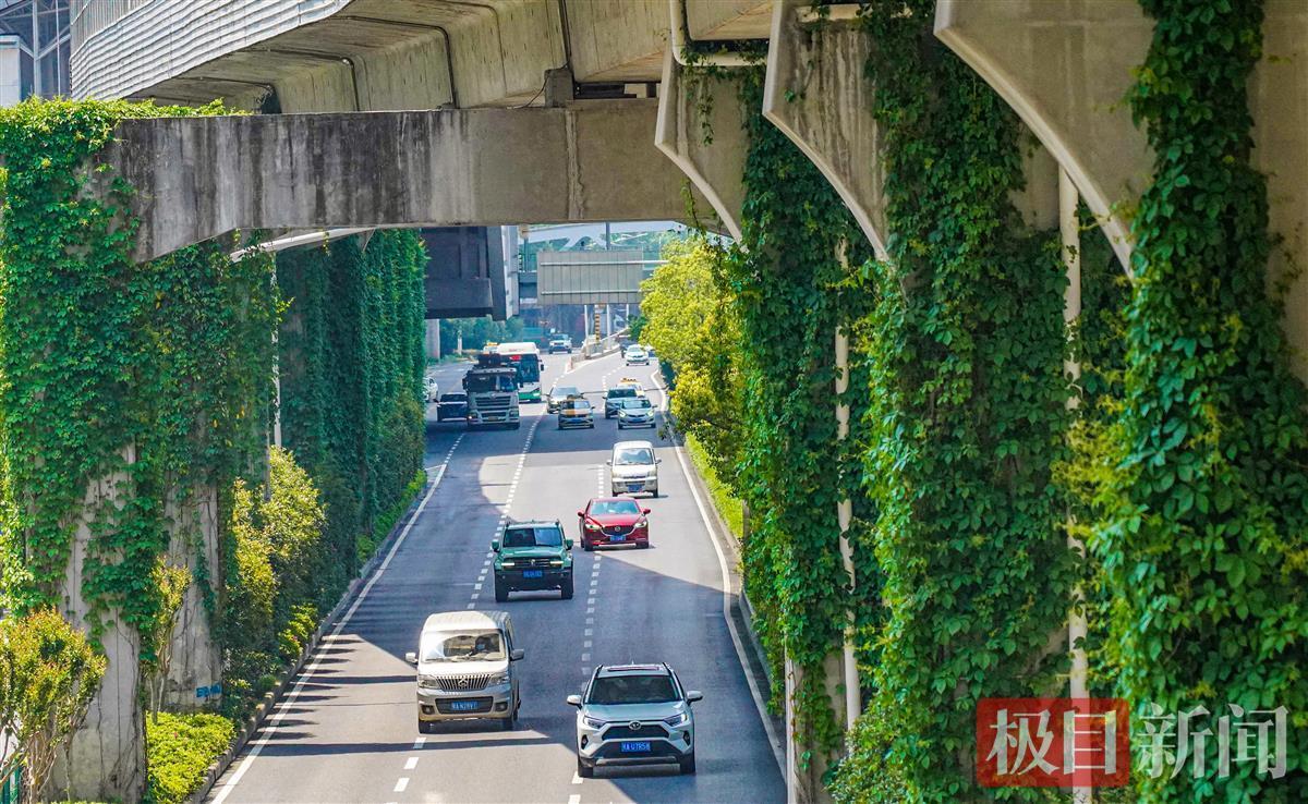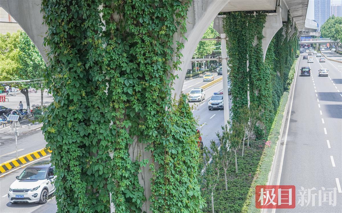 4月24日,极目新闻记者在轻轨一号线二七路站附近看到,爬山虎顺着桥墩向上,绿绿的叶子仿佛给桥墩披上了绿色的“春装”,成为一道风景。