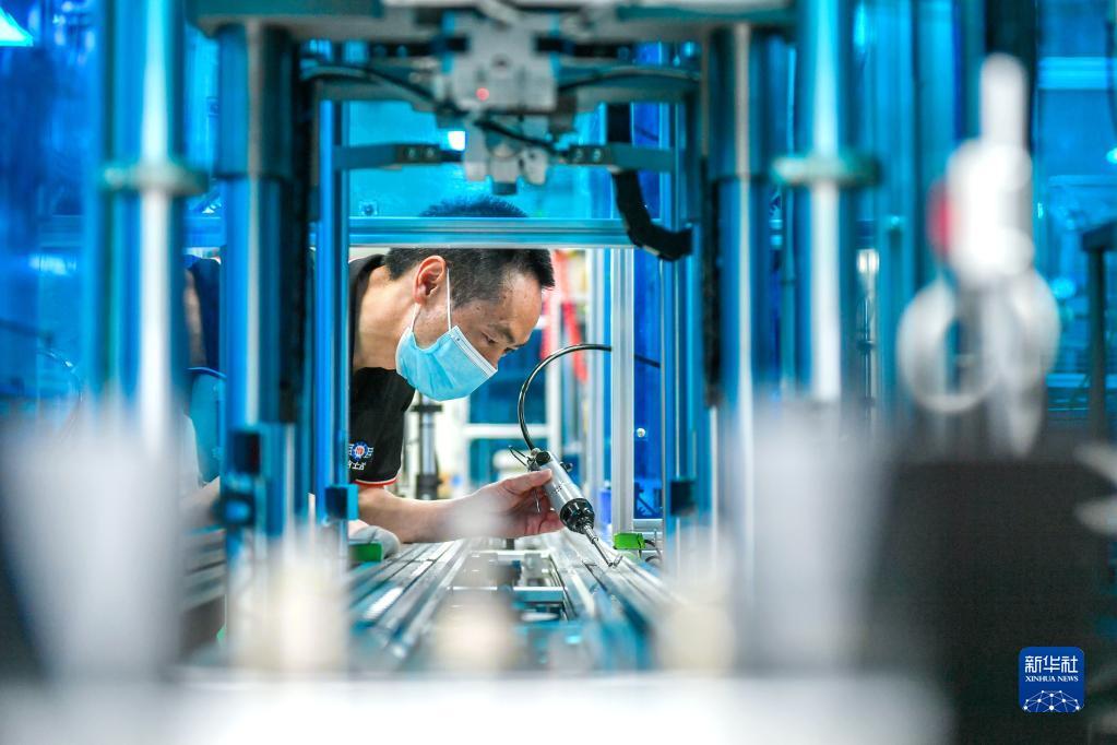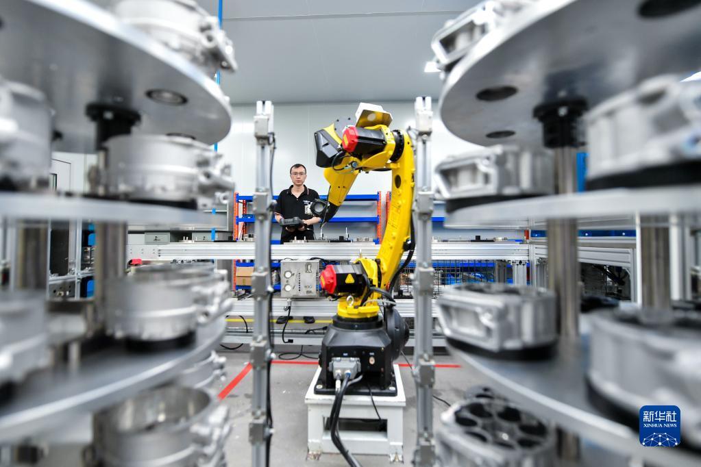 4月25日,在位于浙江省湖州市长兴经济技术开发区的浙江吉士达新能源科技有限公司,技术人员操控机器人加工新能源汽车空调压缩机部件。