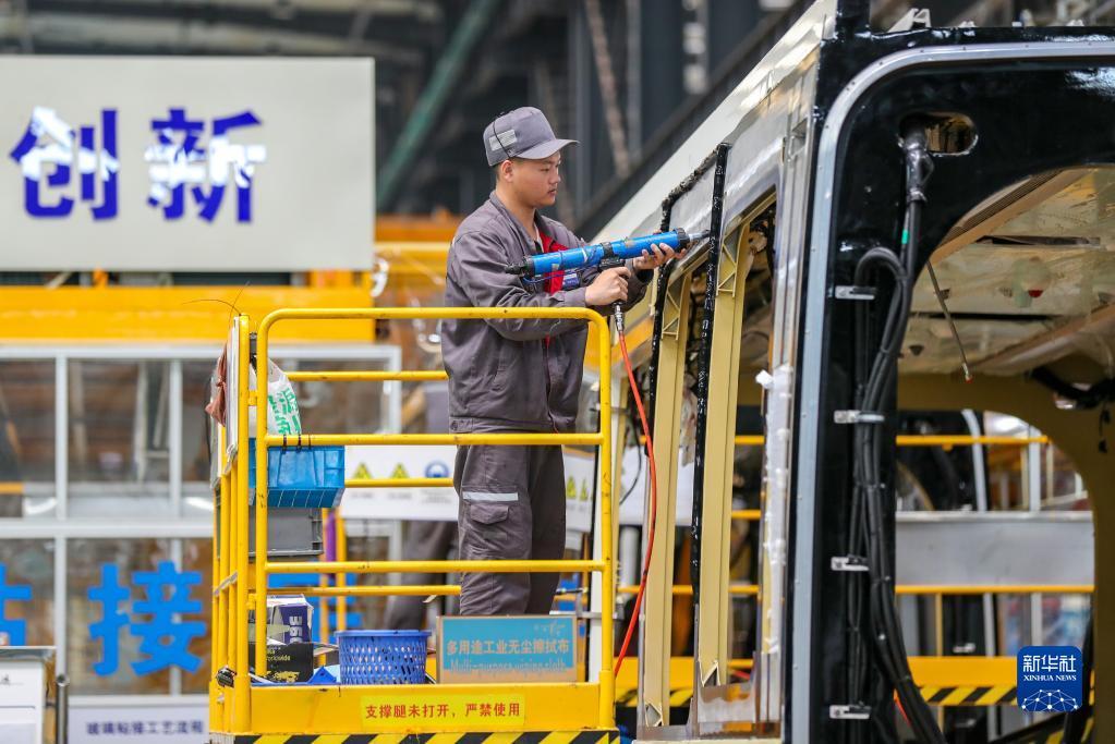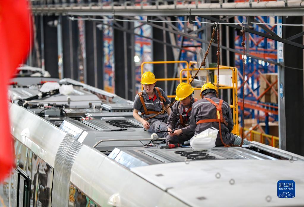 4月24日,在位于四川省宜宾市三江新区的中车铁投轨道交通产业基地生产车间,工人在生产安装智轨电车(智能轨道快运系统)。已有多个国家和地区就智轨项目进行洽谈,希望引进该项目。