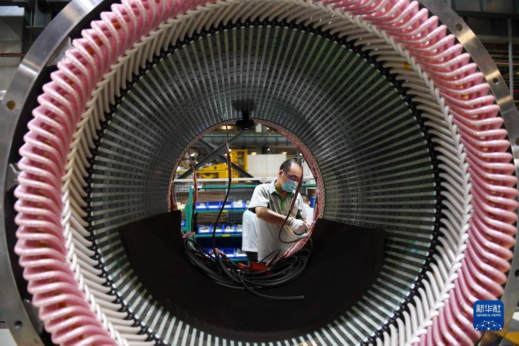 4月24日,在位于福州市的利莱森玛电机科技(福州)有限公司,工人在发电机生产车间工作。