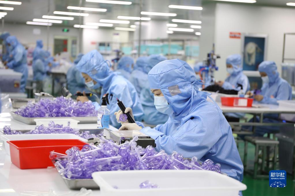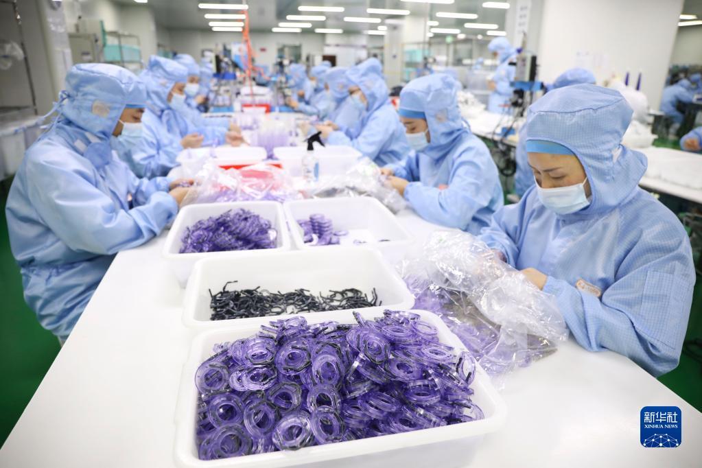 4月25日,在浙江省杭州市桐庐经济开发区一家医疗器械生产企业,工人在组装、检测医疗器械。