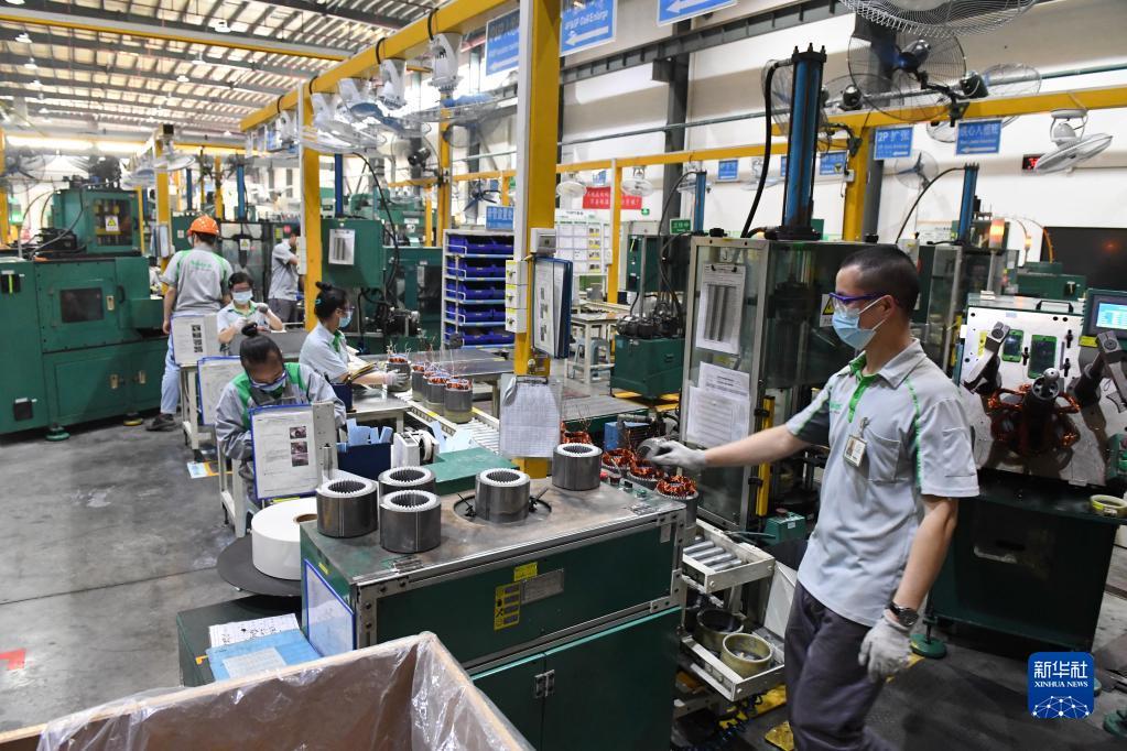 4月24日,在位于福州市的利莱森玛电机科技(福州)有限公司,工人在电动机生产车间工作。