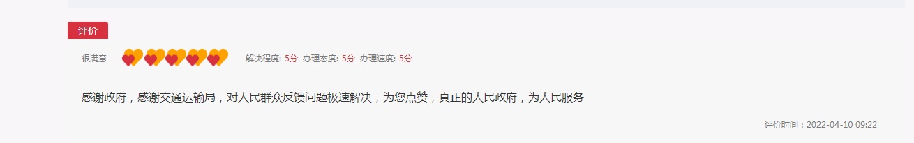 人民网石家庄4月25日电 (祝龙超)“感谢政府,感谢交通运输局,对人民群众反馈问题极速解决,为您点赞,真正的人民政府,为人民服务。”近日,河北省石家庄市网友孙先生在人民网“领导留言板”留言,对当地留言办理部门迅速办理自己留言反映的问题连连点赞。