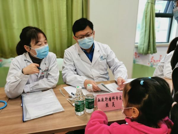 熊昊(左二)在接待小患儿咨询(资料图)。