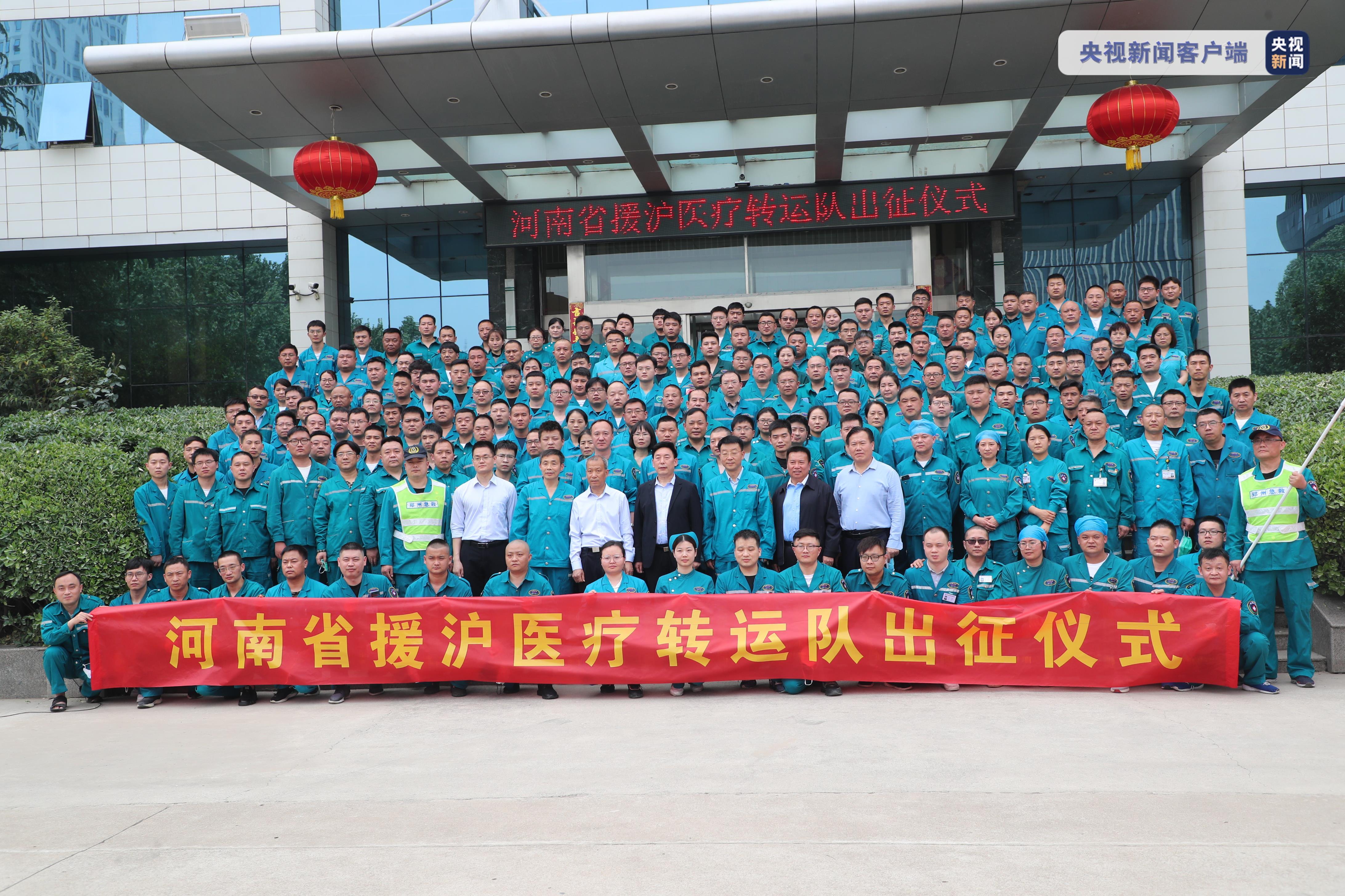 4月25日上午,在郑州市紧急医疗救援中心广场上,由来自郑州、洛阳、新乡、商丘、周口、平顶山、焦作、濮阳、南阳、驻马店十个地市的51辆急救车190名队员组成的河南省援沪医疗转运队集结后,驰援上海。