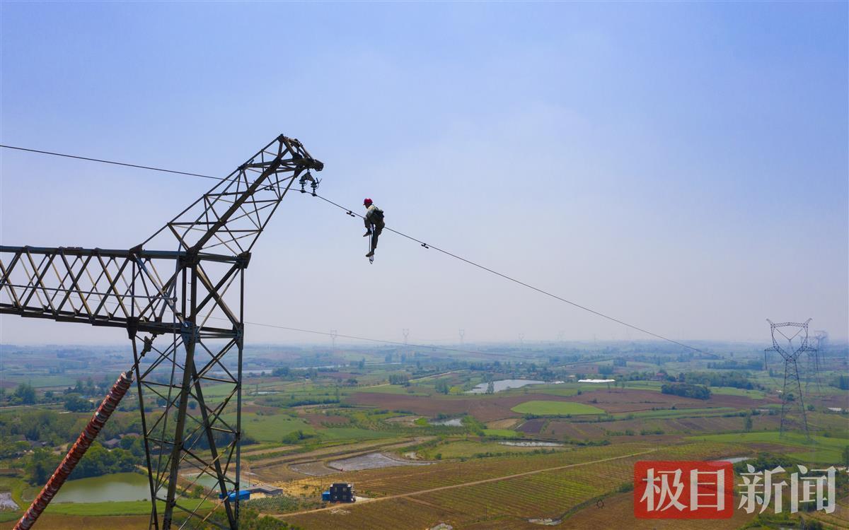 4月21日,国网湖北电力员工在位于湖北荆门钟祥市的特高压交流1000千伏南荆Ⅰ线435号塔的架空地线上对防振锤滑移进行复位,保障线路健康运行。