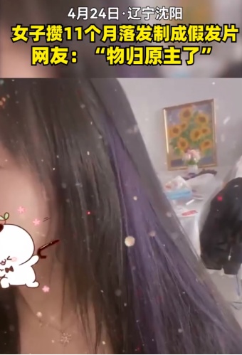 3、女子攒11个月落发做成假发片 24日,辽宁沈阳市民杨女士用自己掉的头发制作成了4条假发片。杨女士说,这些都是她洗头、梳头时候掉落的头发,她从去年5月份开始收集,今年4月份赶上居家隔离,就买来发扣、胶棒、染发剂制成了假发片。(@人民网)