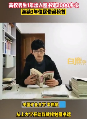 3、努力不会白费!男生一年出入图书馆2000多次 近日,中国矿业大学公布了图书馆借阅榜,李伟昊连续3年位居榜首,一年2000多次出入图书馆,书籍阅读量达240余册。目前,他以初试第一的成绩顺利考研至南京大学中国古代文学方向。(@人民日报)