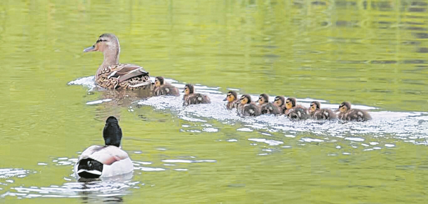 4月24日,他特意带着相机到公园蹲守,拍到两只大鸭子带着一群小鸭子,就像一个快乐的大家庭。