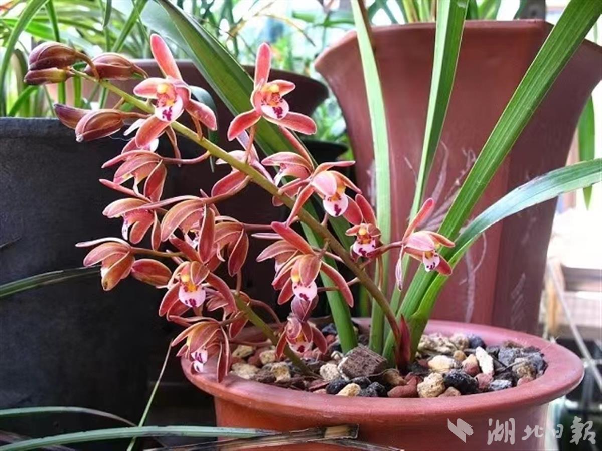 多花兰,别名蜜蜂兰、岩兰,是兰科兰属附生植物,花茎直立或稍倾斜,花朵红褐色,叶长椭圆形,2-4枚着生于大型的假鳞茎上,生于林中或林缘树上,或溪谷旁透光的岩石上或岩壁上,叶革质肥厚并具有光泽,抗旱防寒力强,蒴果近长圆形,花期4-8月。