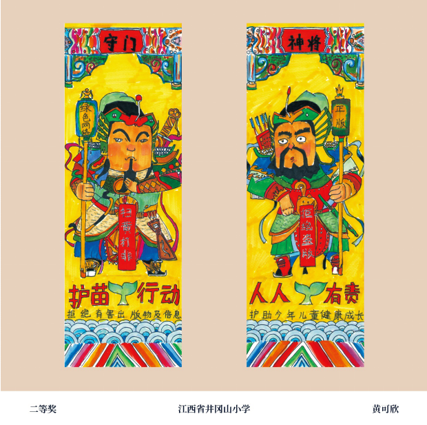 作品主题鲜明,巧妙借鉴中国门神形象,造型栩栩如生,富于童趣。运用民间对比色,是传统艺术与现代设计相结合的佳作。