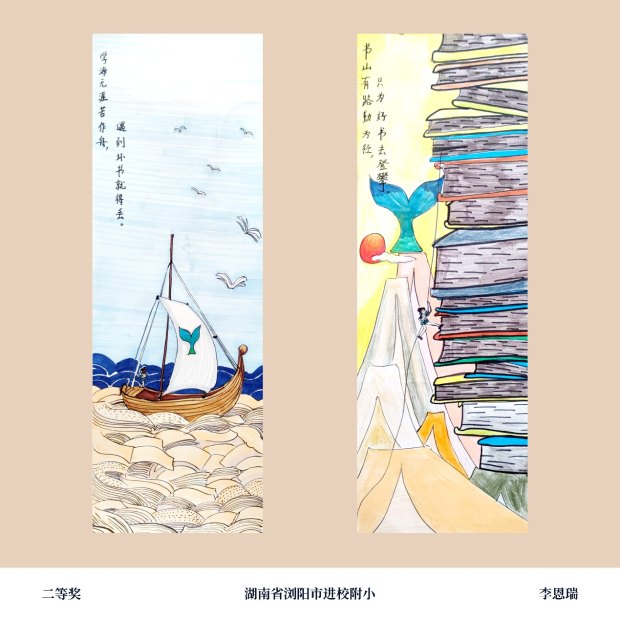 作品紧扣主题,布局合理,刻画细致,色彩明艳,有益书籍滋养下的世界熠熠生辉,各类元素的运用充满天马行空的想象力。