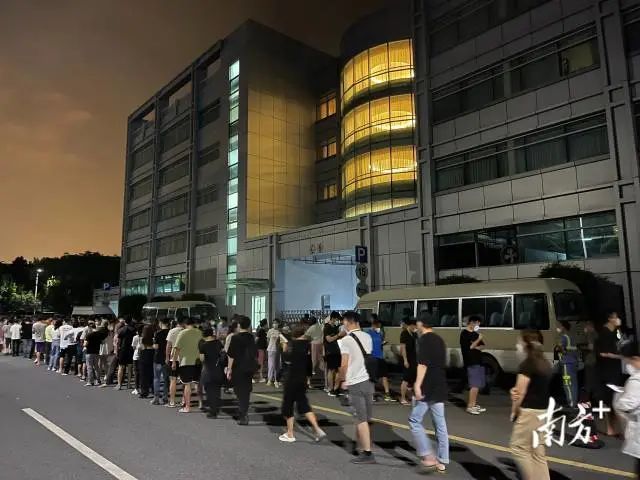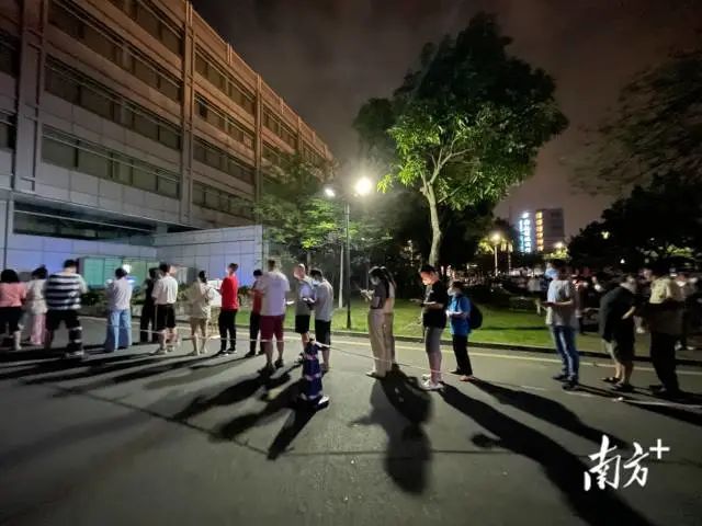 28日凌晨2时许,广州白云机场南航明珠大酒店楼前,现场人员正进行全员大规模核酸检测。
