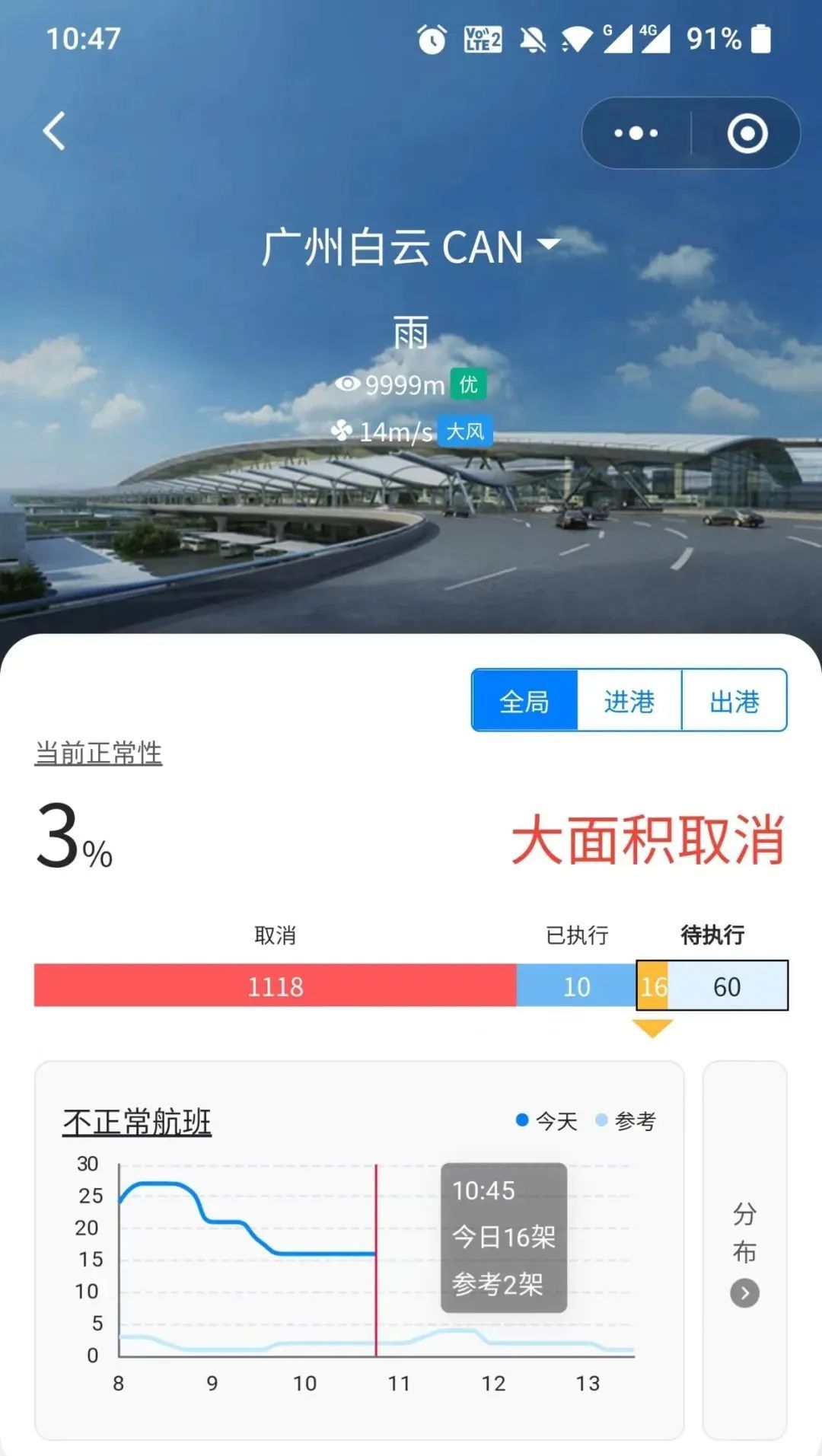据飞常准数据显示,广州白云机场今天预计取消航班超过1100班。截至4月28日10:30,据飞常准App数据显示,今日广州白云机场计划执行进出港航班近百架,航班取消占比超9成。