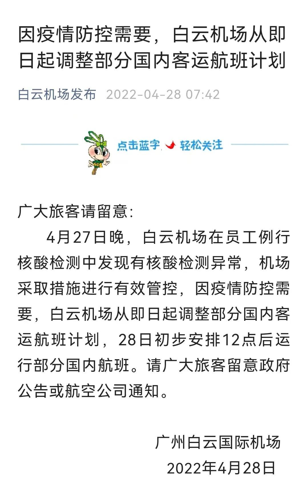 4月27日晚,白云机场在员工例行核酸检测中发现有核酸检测异常,机场采取措施进行有效管控,因疫情防控需要,白云机场从即日起调整部分国内客运航班计划,28日初步安排12点后运行部分国内航班。请广大旅客留意政府公告或航空公司通知。