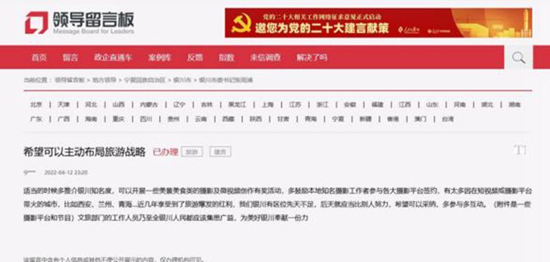 人民网银川4月28日电 (刘峰、穆国虎)近日,宁夏一网友在人民网“领导留言板”上向宁夏银川市委书记留言建议,适当的时候应该多推介银川知名度,可以开展一些美景美食类的摄影及微视频创作有奖活动,多鼓励本地知名摄影工作者参与各大摄影平台签约,“希望可以采纳,为美好银川奉献一份力量。”