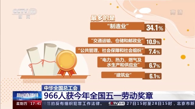 今年获得表彰的有全国五一劳动奖状200个、全国工人先锋号956个、全国五一劳动奖章966个,在五一劳动奖章获得者中,产业工人占到40.1%。