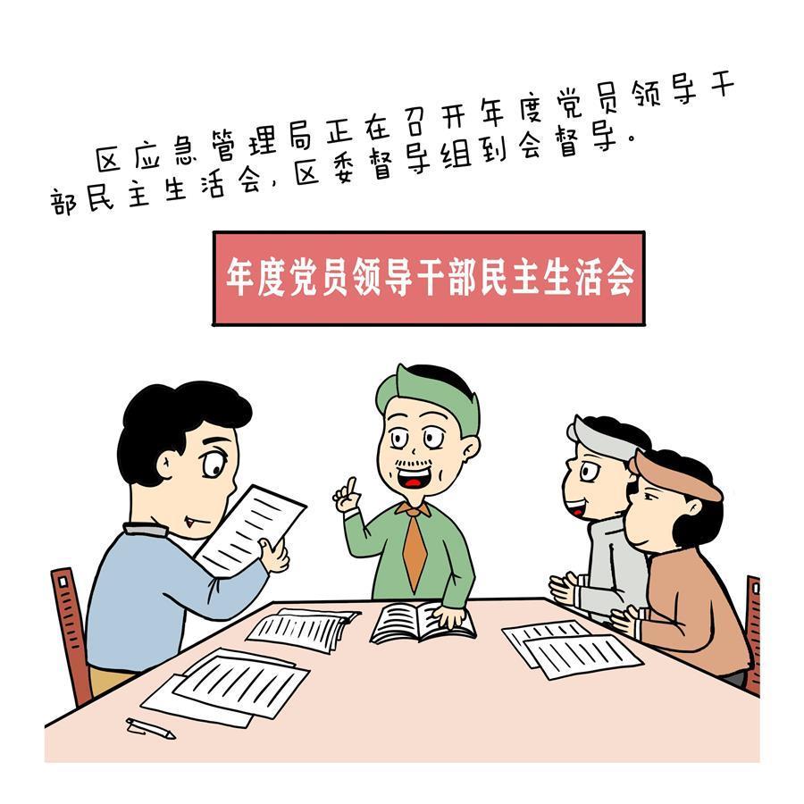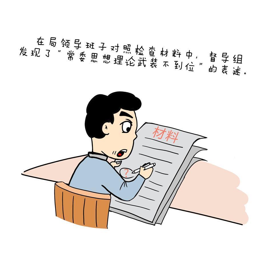该廉政漫画讲述:某市一个区的应急管理局正在召开年度党员领导干部民主生活会,区委督导组到会督导。在局领导班子对照检查材料中,督导组发现了“常委思想理论武装不到位”的表述。