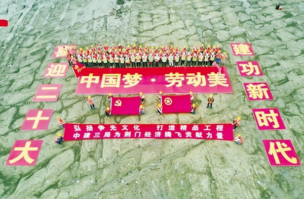 4月27日,在中建三局基建投公司沪渝蓉高铁项目上,100名建设者齐聚武宜段钟祥南站工地,开展“中国梦·劳动美——喜迎二十大 建功新时代”快闪活动,迎接“五一”劳动节,激发一线干部职工高质量建设好高铁项目。