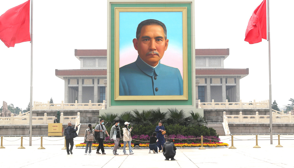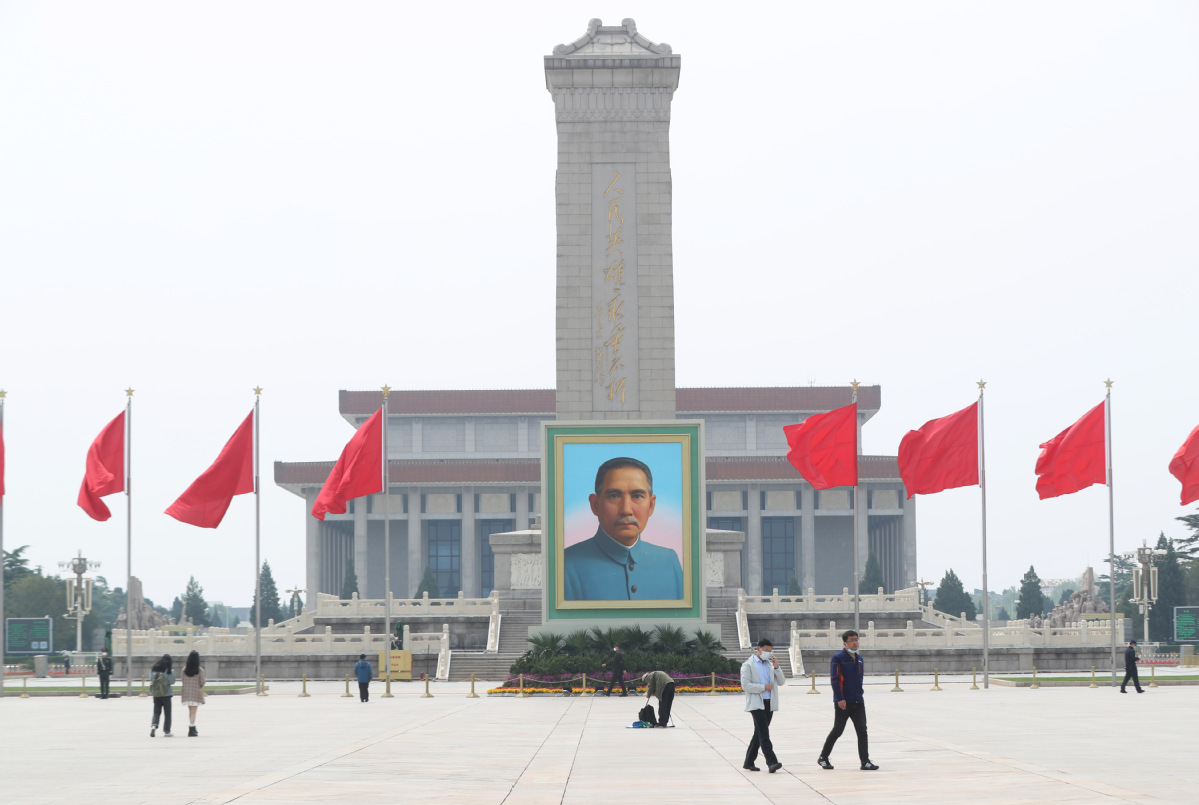 4月29日,孙中山先生的巨幅画像亮相北京天安门广场,迎接“五一”国际劳动节的到来。中国日报记者 邹红 摄