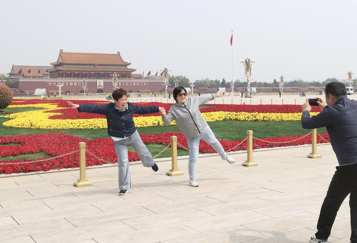 4月29日,游客在布置一新的造型花卉前拍照留念。中国日报记者 邹红 摄