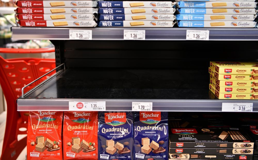 4月1日,意大利罗马一家超市货架上部分商品缺货。新华社记者金马梦妮摄