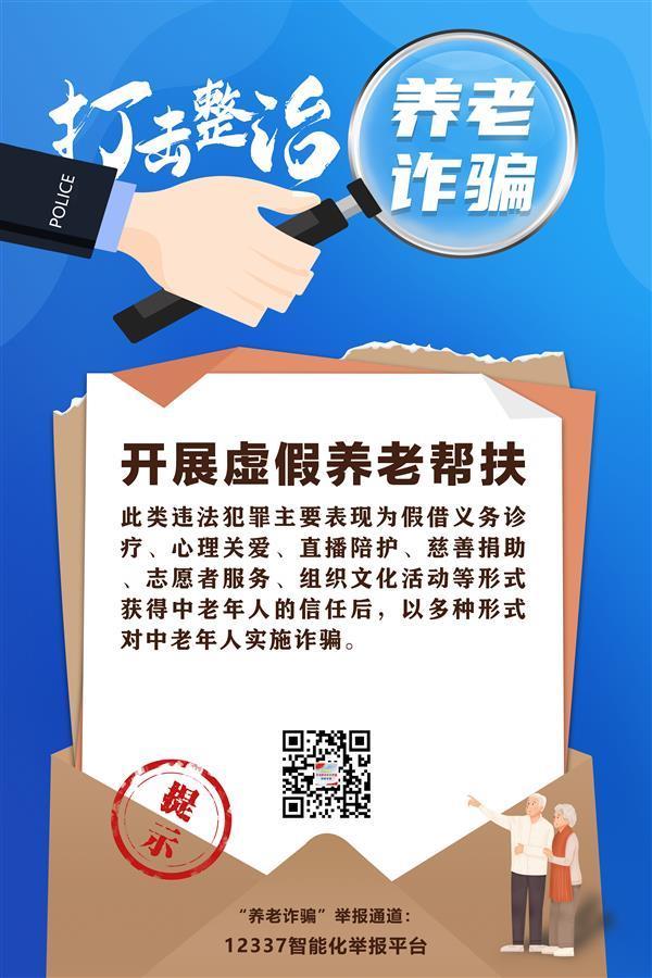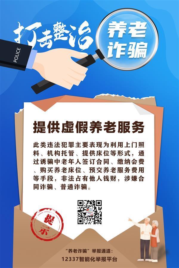 据悉,此次专项行动为期半年,各地公安机关将以提供“养老服务”、投资“养老项目”、销售“养老产品”、宣称“以房养老”、代办“养老保险”、开展“养老帮扶”这六大类养老诈骗形式作为主攻方向,按照“稳、准、狠”的要求,快侦快破一批典型案件。