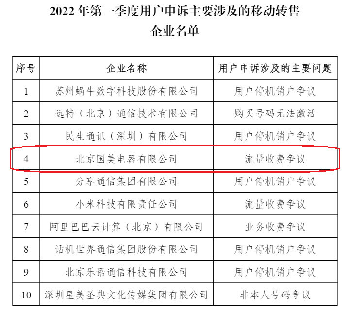 2022年第一季度用户申诉主要涉及的移动转售企业名单显示,北京国美电器有限公司用户申诉涉及的主要问题为流量收费争议。