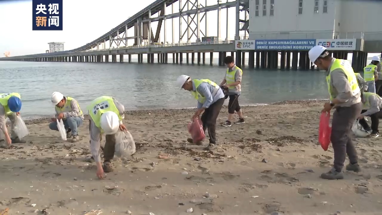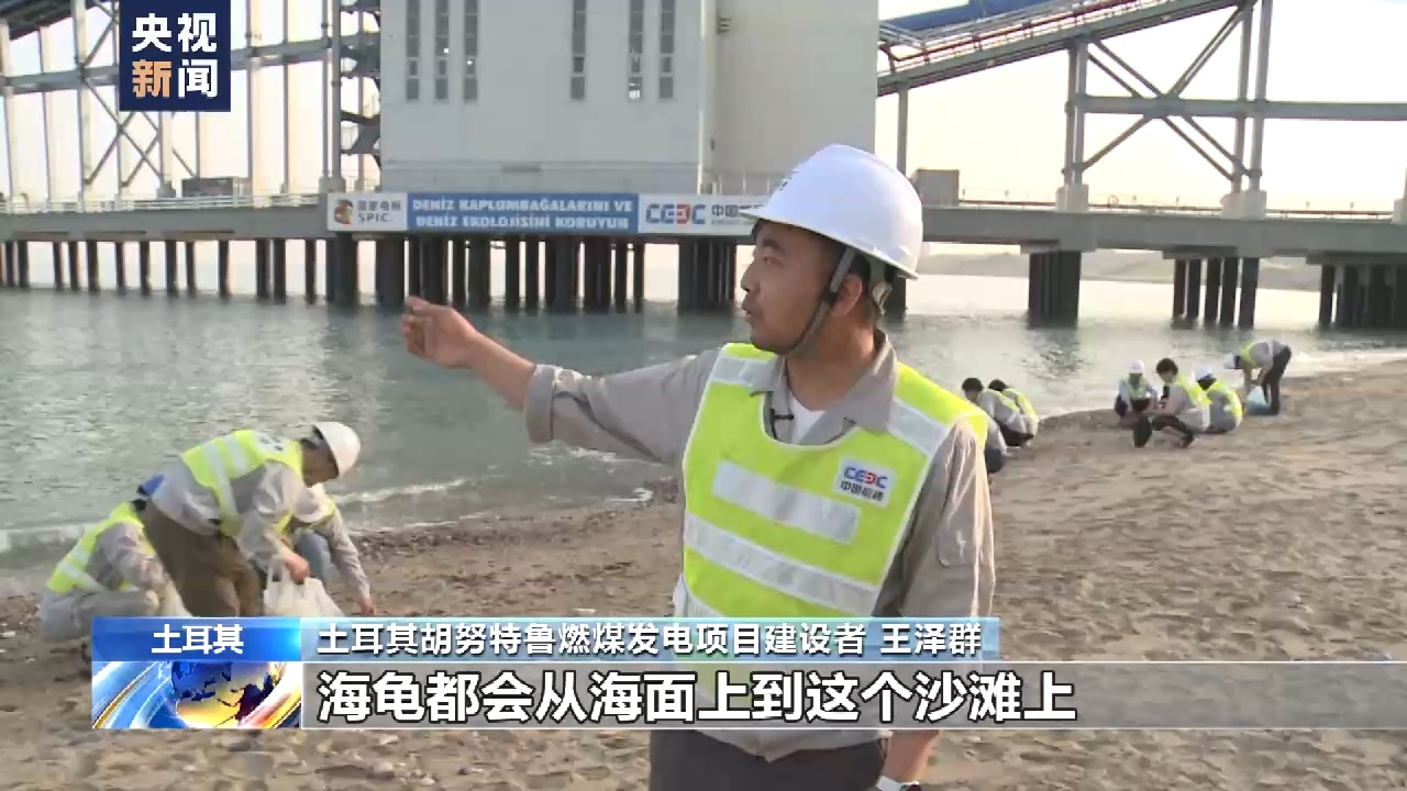 土耳其胡努特鲁燃煤发电项目建设者 王泽群:我们项目所在的这个沿海地区是最重要的绿海龟的筑巢区之一,每年的这个时间段,海龟都会到这个沙滩上进行产卵和筑巢。所以我们的小伙伴现在正在清理海边的杂物和垃圾。如果这个垃圾不清理,就比如说塑料垃圾,如果海龟不小心把它吃掉的话,它不会消化,就有可能导致海龟的死亡。