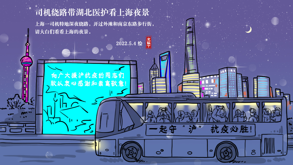 近日,上海,一位司机接到下夜班的湖北援沪医疗队员,特地深夜绕路,开过外滩和南京东路步行街,请大白们看看上海的夜景。谢谢你们守护上海,疫情之后再来尽兴游玩!每一天,我们都会手绘一幅正能量速写画,欢迎参与转发,一起传递正能量↓↓↓