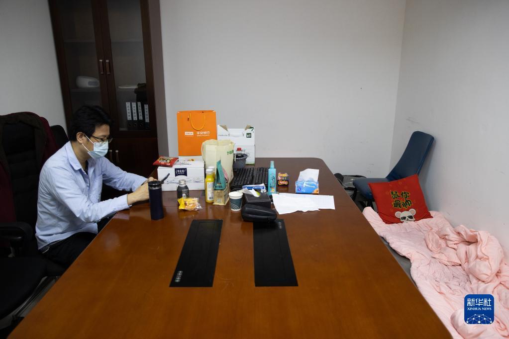 5月4日,在浦东陆家嘴平安金融大厦,平安银行上海分行员工姚峰值班间隙在办公室休息,旁边就是他晚上睡觉的床铺。