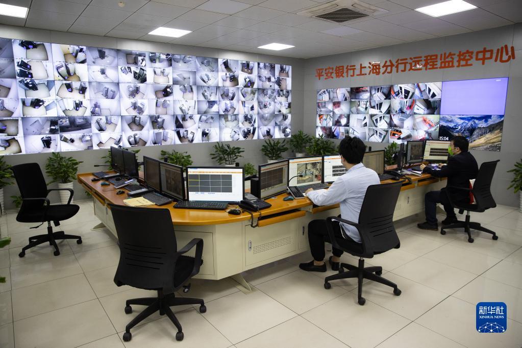 5月4日,在浦东陆家嘴平安金融大厦,平安银行上海分行员工姚峰(左)、徐斌在远程监控中心值班。